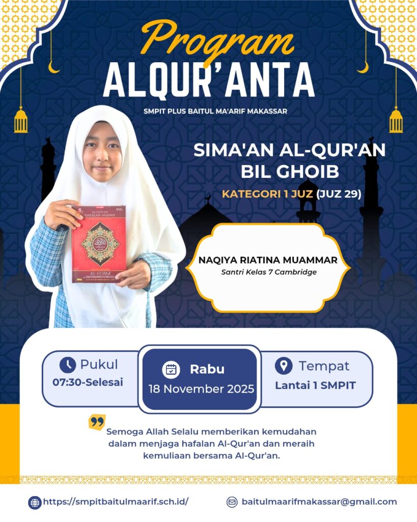 -SMPIT Plus Baitul Ma’arif Makassar baru saja menggelar acara Sima’an Al-Qur’an Bil Ghoib yang bertajuk “Alqur’anta”. Acara ini menampilkan Naqiya Riatina Muammar, seorang santri kelas 7 Cambridge, yang berhasil memukau seluruh hadirin dengan hafalan Al-Qur’an 1 Juz (Juz 29)